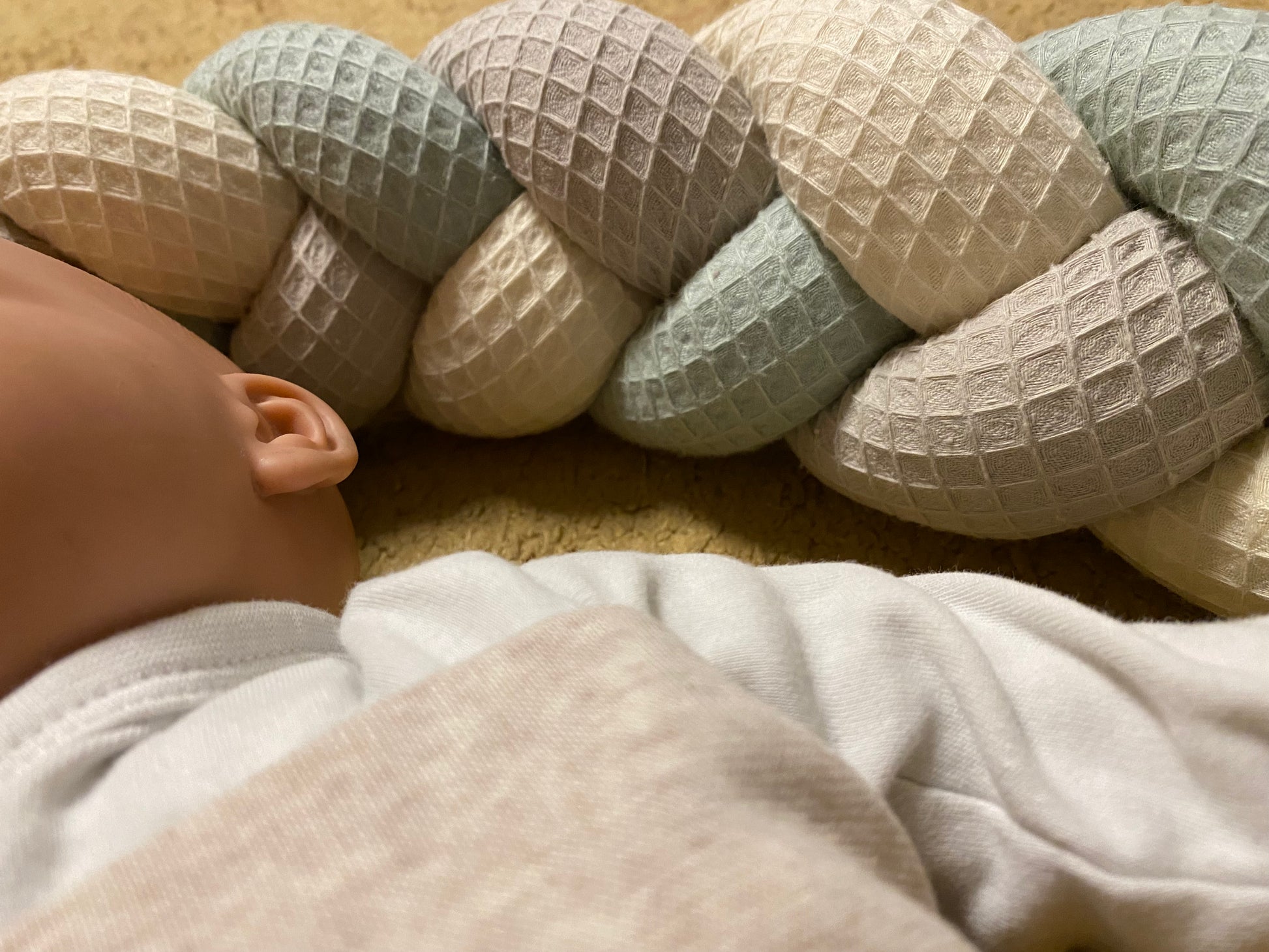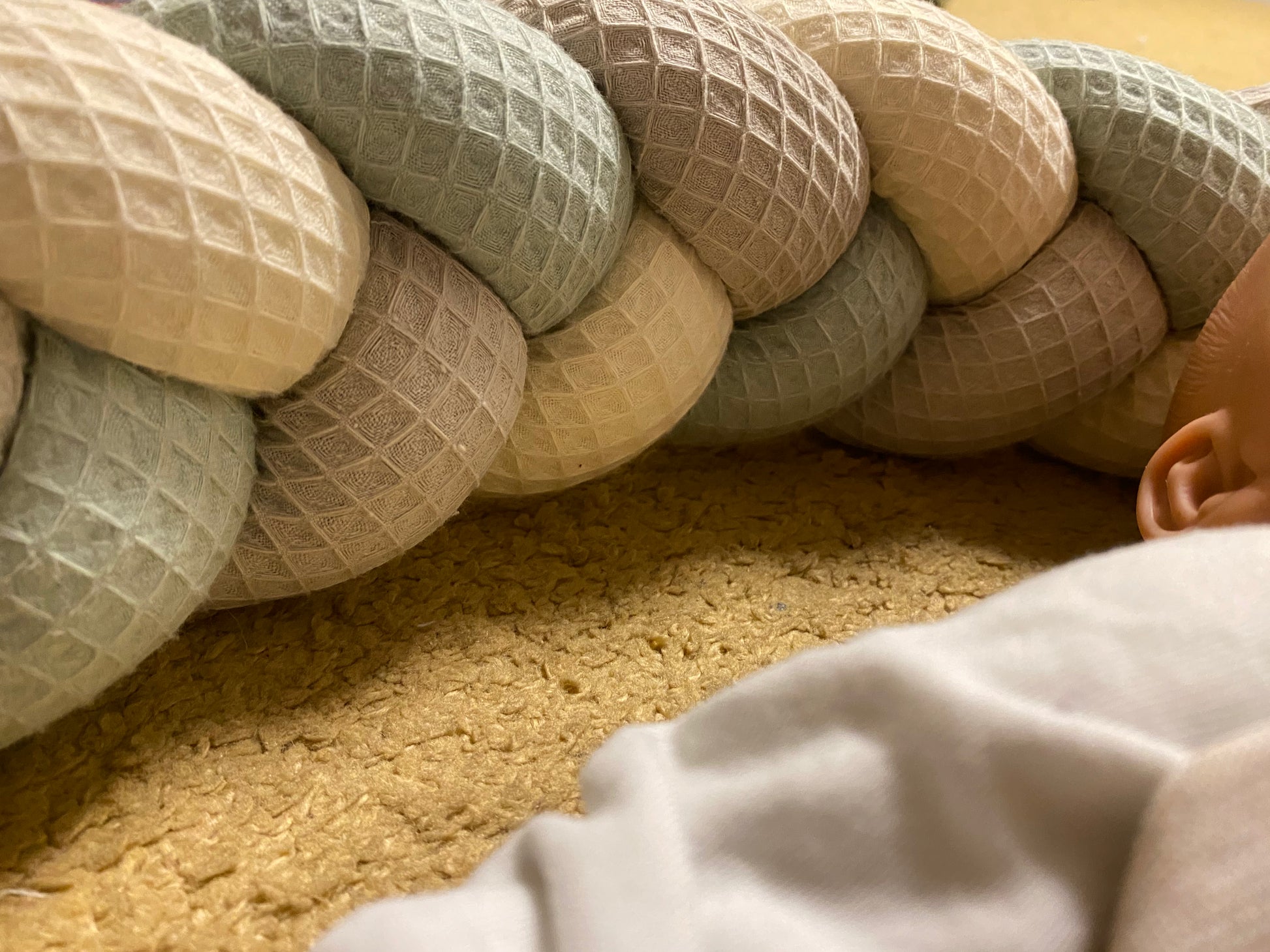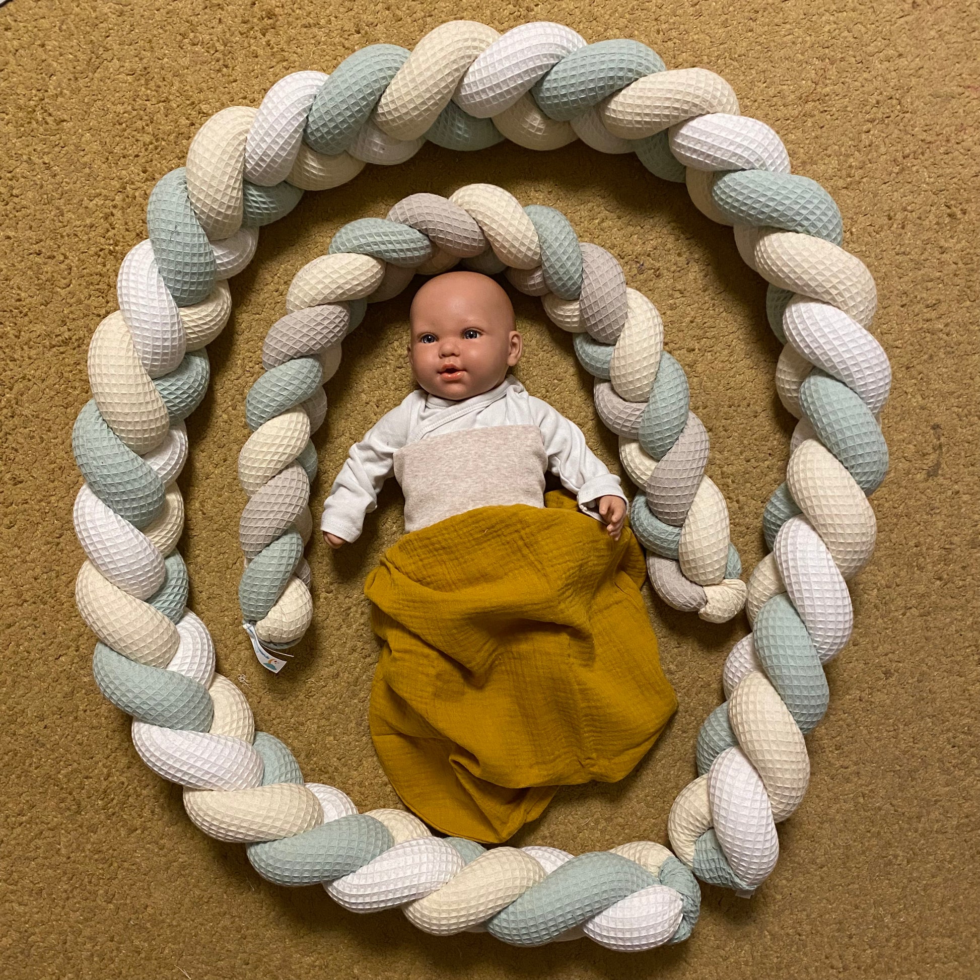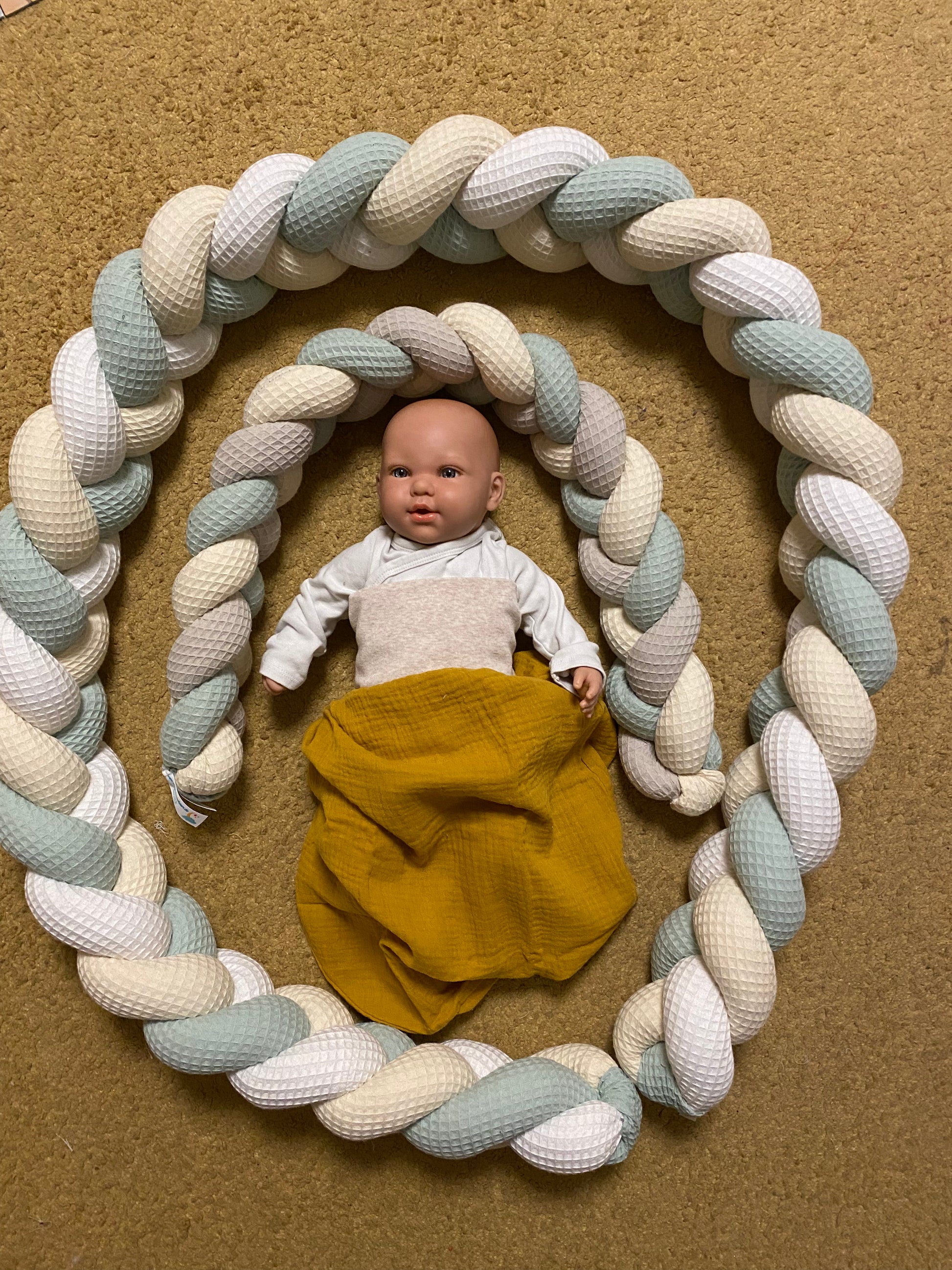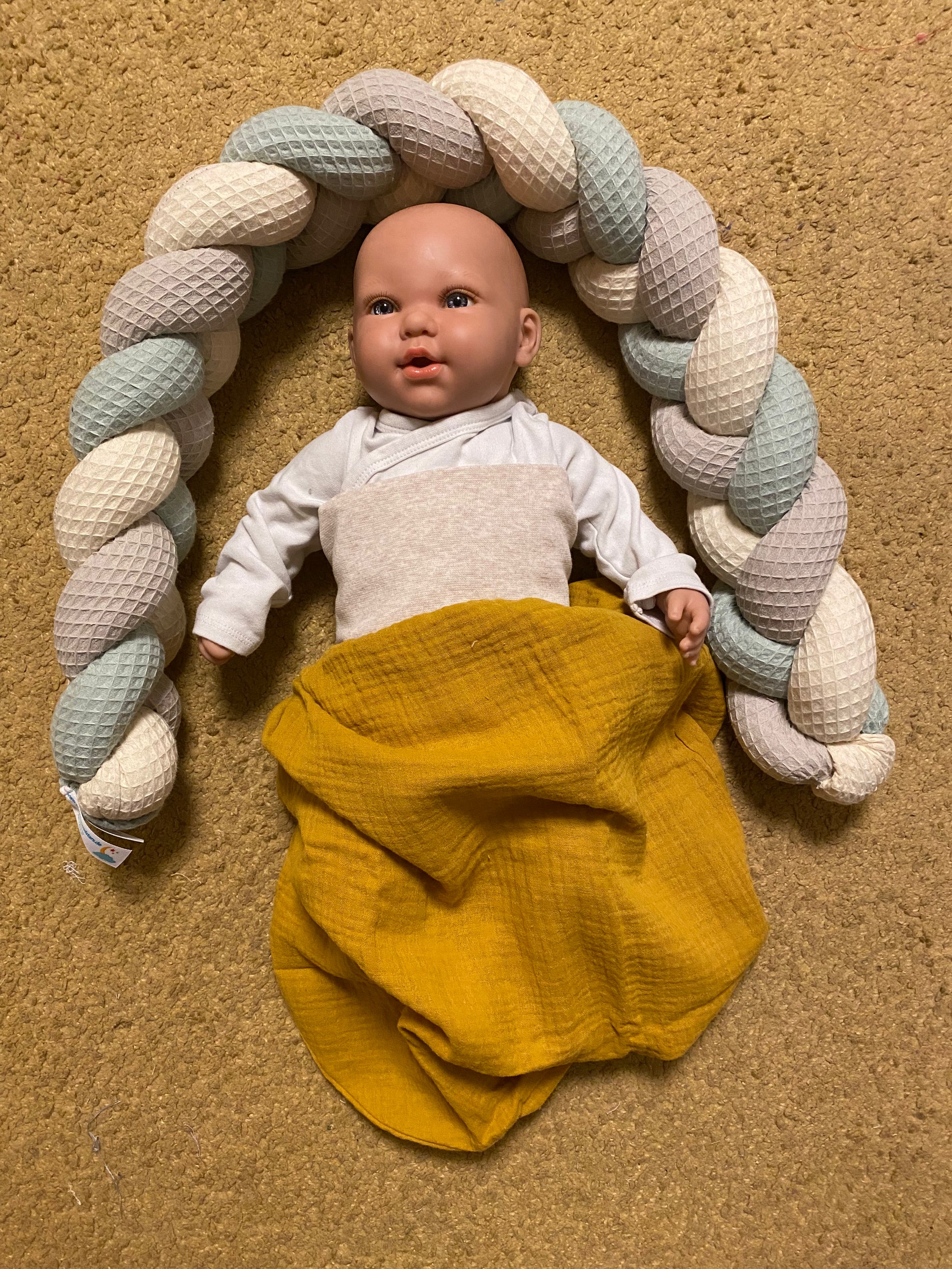 Die Knotenschlange ist ein Deko-Artikel und ist keine Abgrenzung oder Sicherung vor Herunter- oder Herausfallen vom Wickeltisch oder Bettchen!