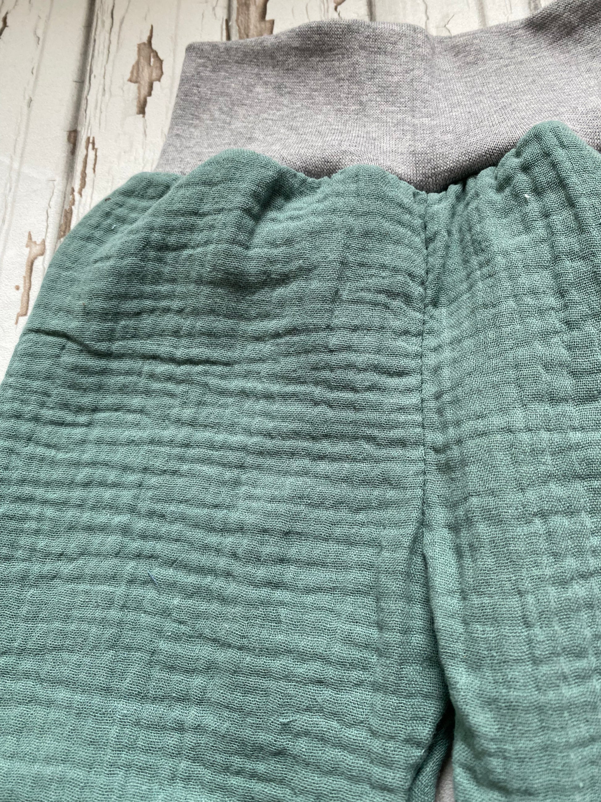 Die Hose ist schön weit. Am Bauch schließt ein elastisches Bündchen ab, der Bund ist angenehm breit und so elastisch, dass nichts einschneidet. Falls das Bündchen zu locker sein sollte, ist eine kleine Öffnung, sodass du einfach ein Gummiband einziehen kannst. Die Hosenbeine schließen ebenfalls mit Bündchen ab, sodass der Stoff nicht über die Schuhe/ Füße rutschen kann.