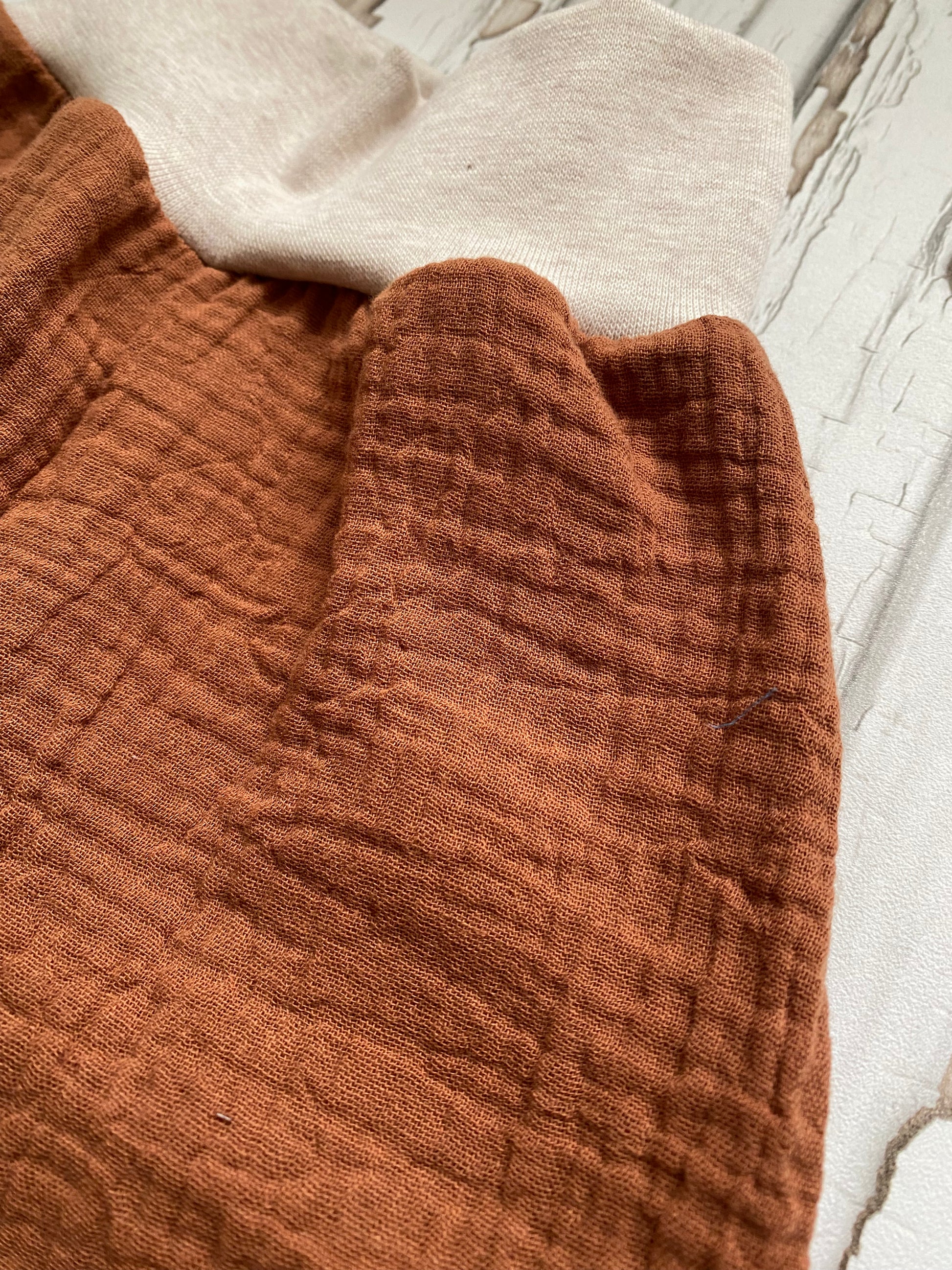 Die Hose ist schön weit. Am Bauch schließt ein elastisches Bündchen ab, der Bund ist angenehm breit und so elastisch, dass nichts einschneidet. Falls das Bündchen zu locker sein sollte, ist eine kleine Öffnung, sodass du einfach ein Gummiband einziehen kannst. Die Hosenbeine schließen ebenfalls mit Bündchen ab, sodass der Stoff nicht über die Schuhe/ Füße rutschen kann.