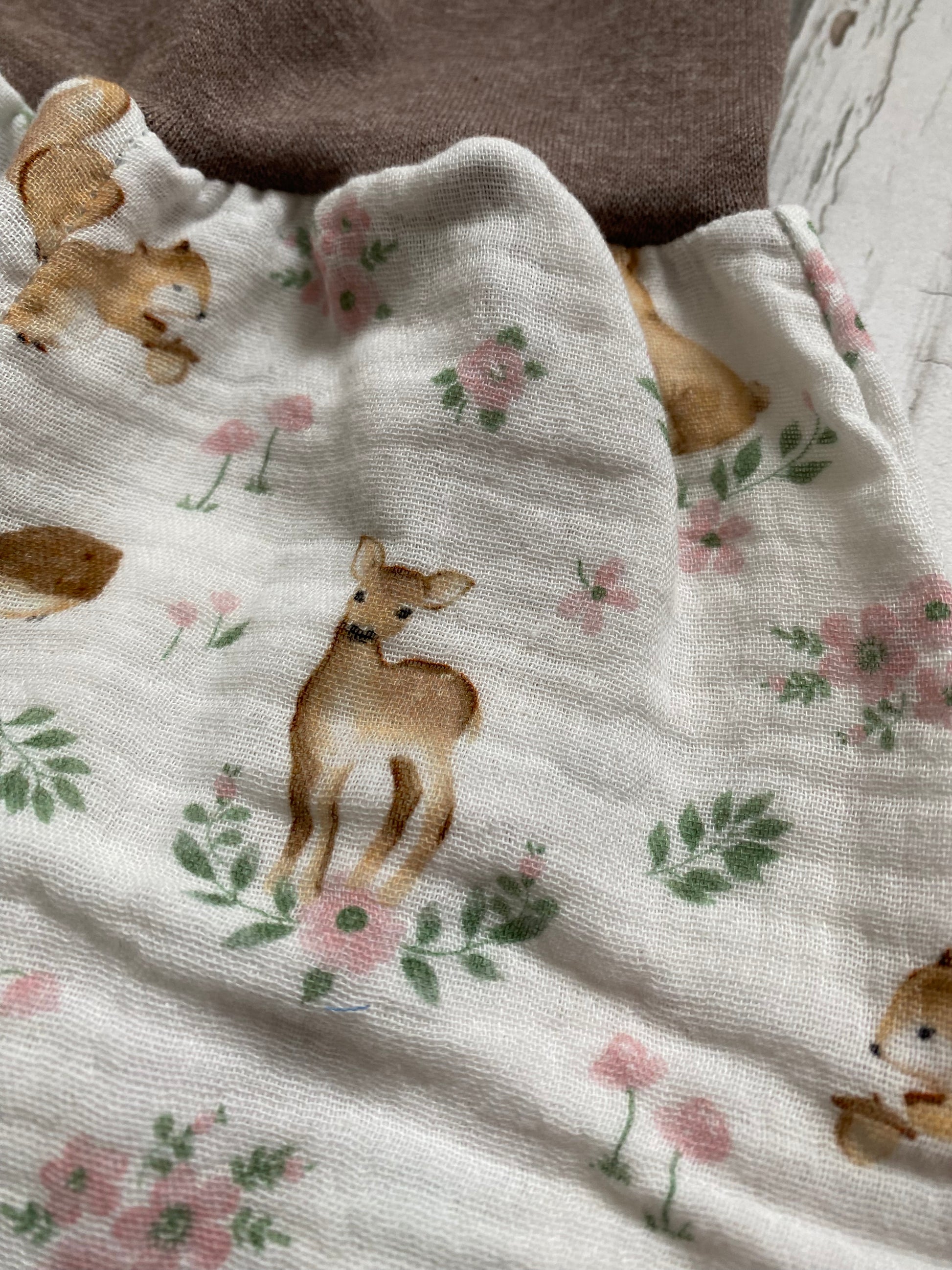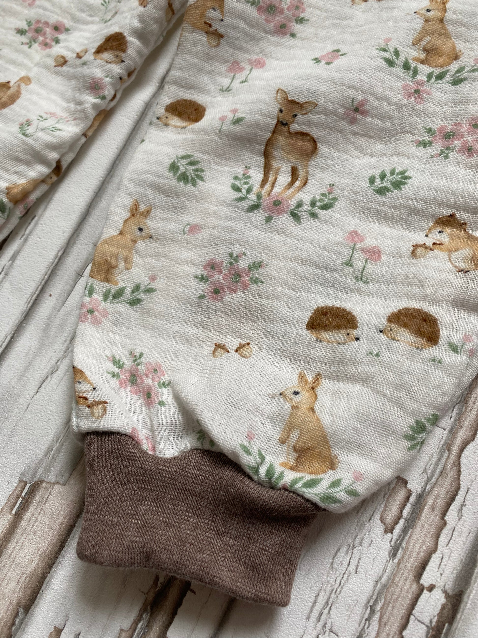 Die Hose ist schön weit. Am Bauch schließt ein elastisches Bündchen ab, der Bund ist angenehm breit und so elastisch, dass nichts einschneidet. Falls das Bündchen zu locker sein sollte, ist eine kleine Öffnung, sodass du einfach ein Gummiband einziehen kannst. Die Hosenbeine schließen ebenfalls mit Bündchen ab, sodass der Stoff nicht über die Schuhe/ Füße rutschen kann.